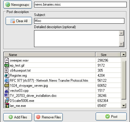 Now all that is left to do is adding some files in the list and specifying newsgroup(s) name, and optional subject and description of the posting session.