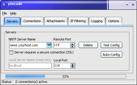 yDecode is an application that serves as intermediate between your favorite news reader client (for example Outlook Express, Windows Live Mail etc.) and actual news server, therefore implementing proxy functionality. It decodes yEnc messages directly in Outlook Express, Windows Mail, Windows Live Mail, Mozilla Thunderbird and many other news reader software like a plug-in. It achieves this by converting posts to the format that your newsreader can understand and display. Except this, yDecode also simplifies your newsgroup browsing and speeds up common operations you can do while reading newsgroups, for example, it can save files for you automatically to a folder of your choice or greatly simplify downloading multipart posts. It is designed to be very easy to use.